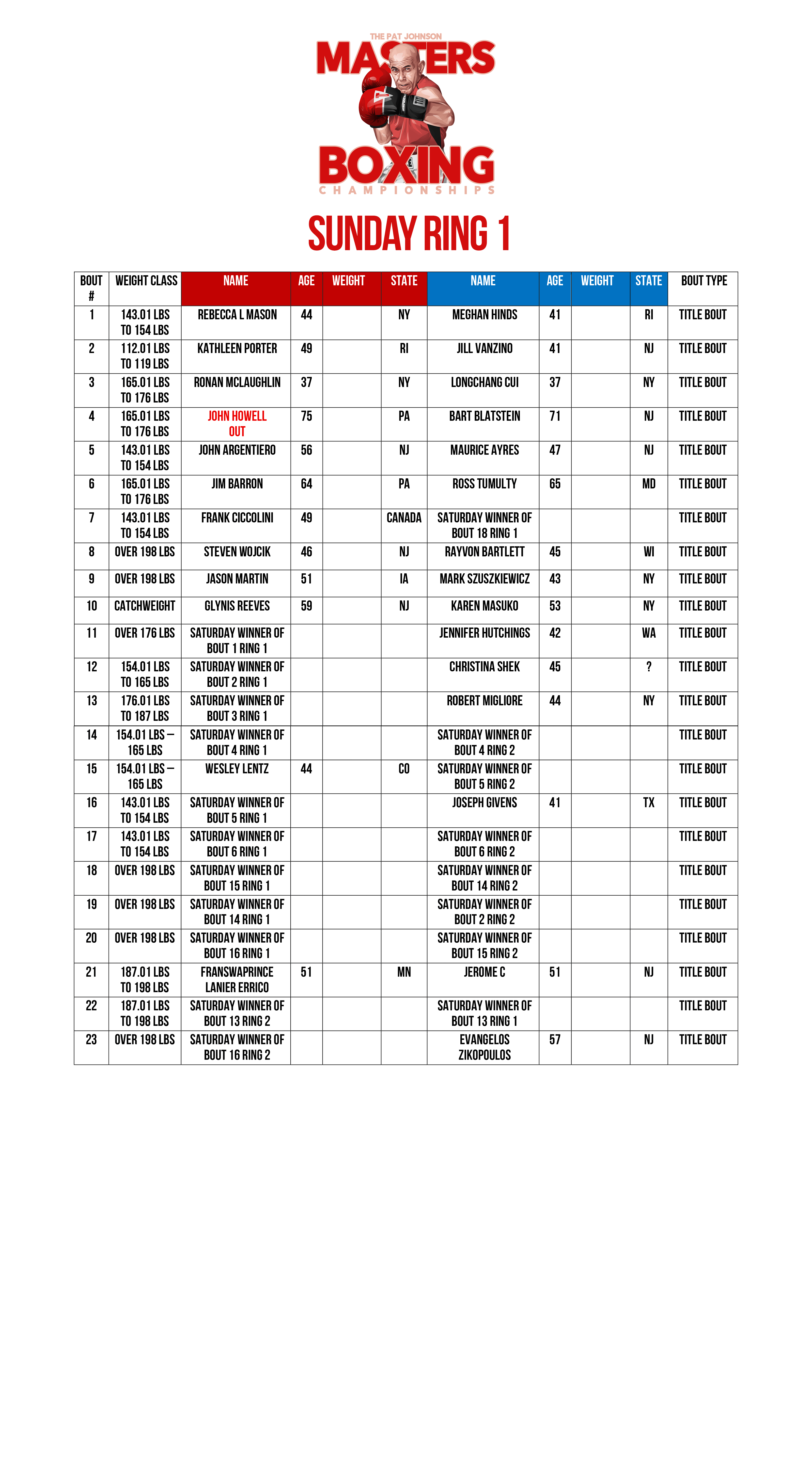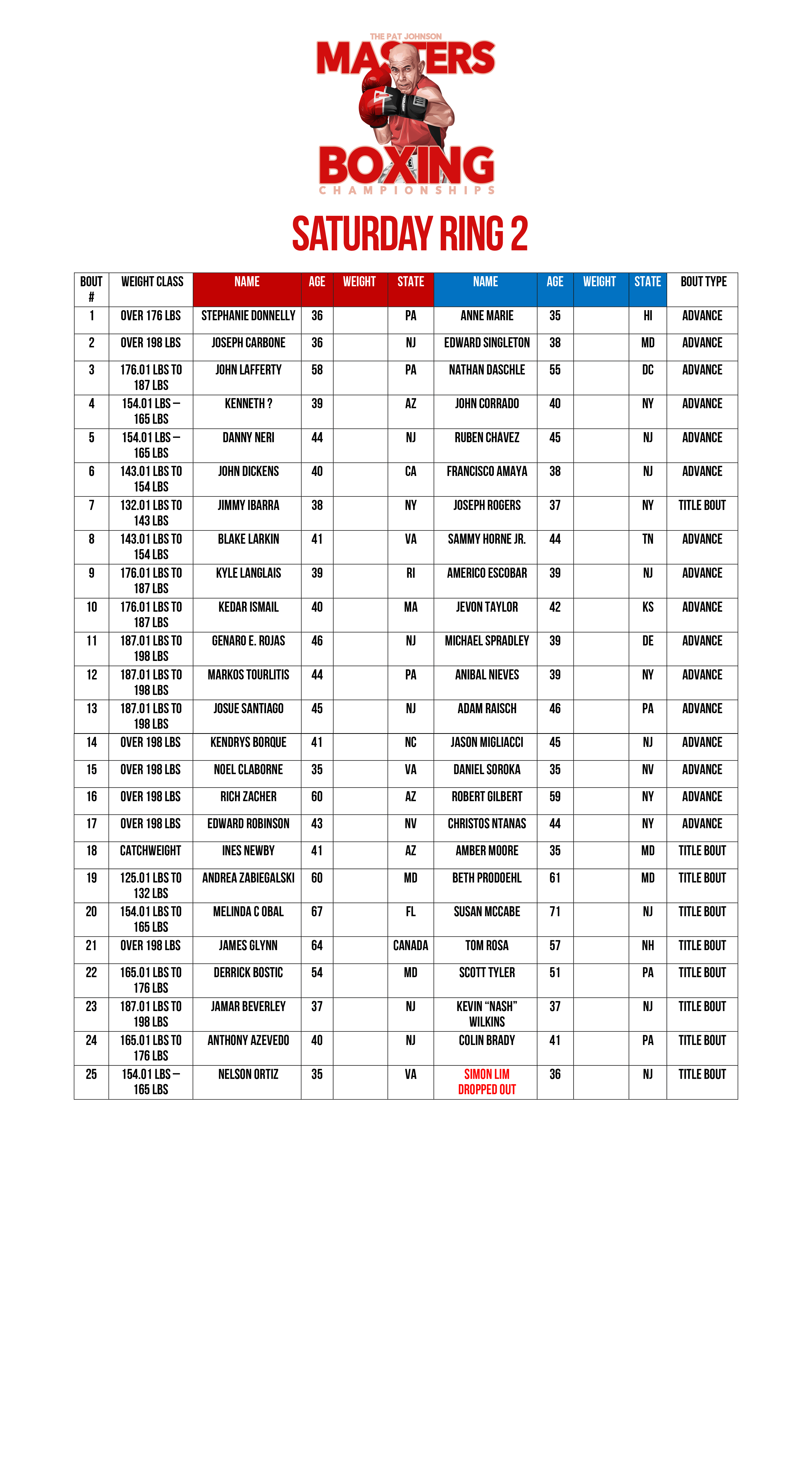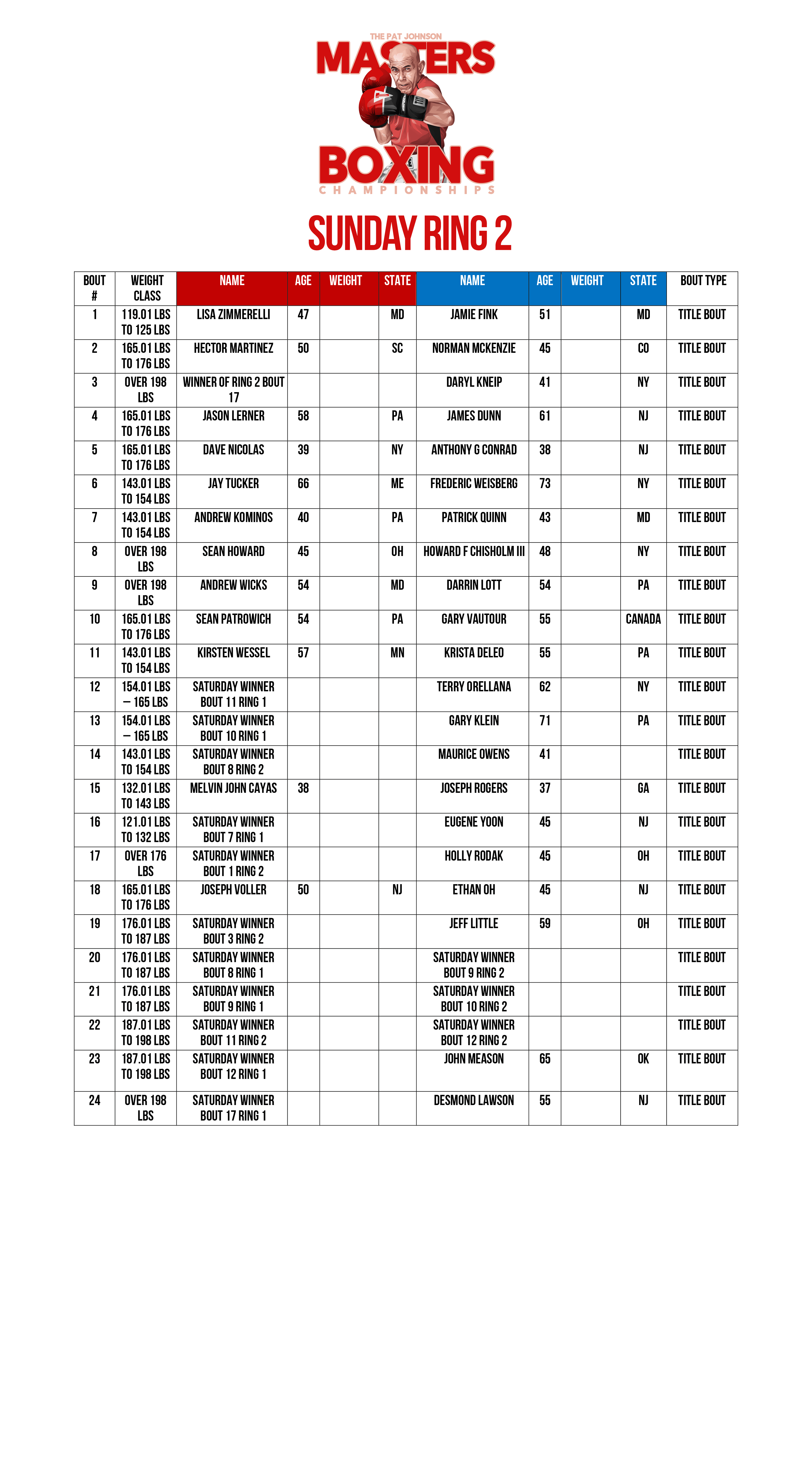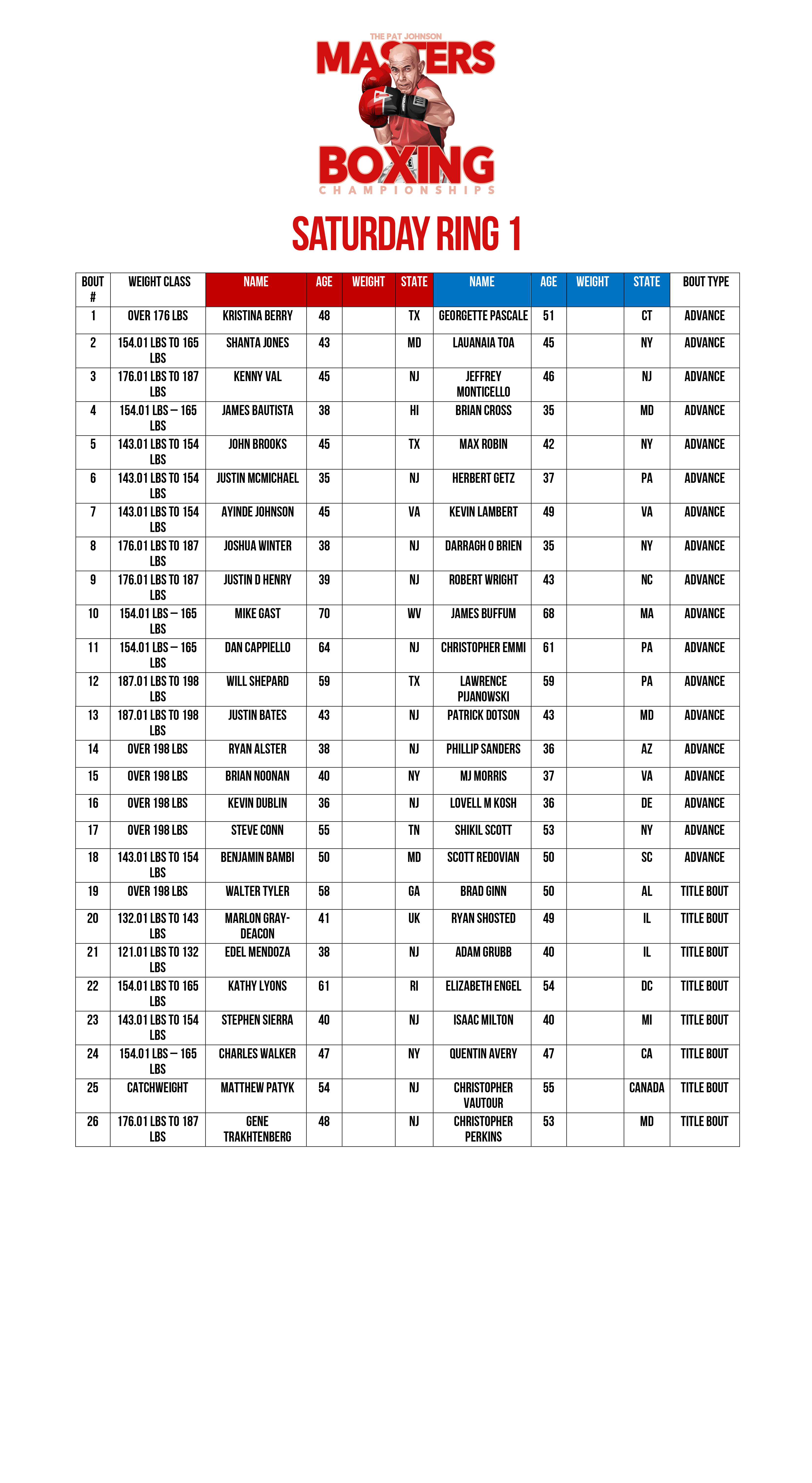 Links for this weekends live stream. The Pat Johnson Masters Boxing Championships